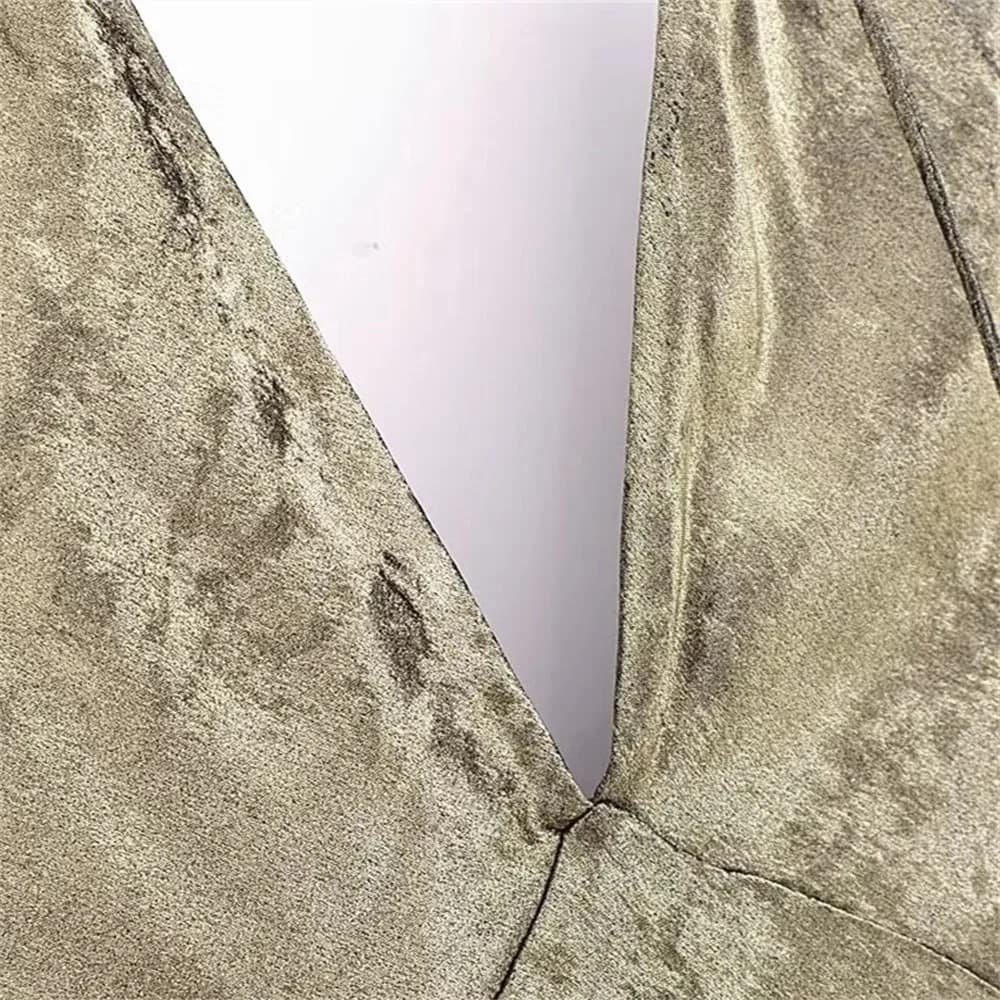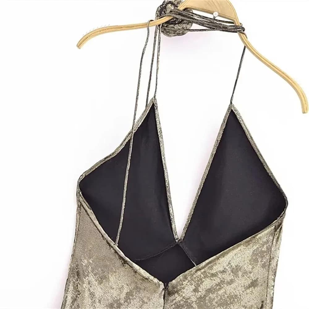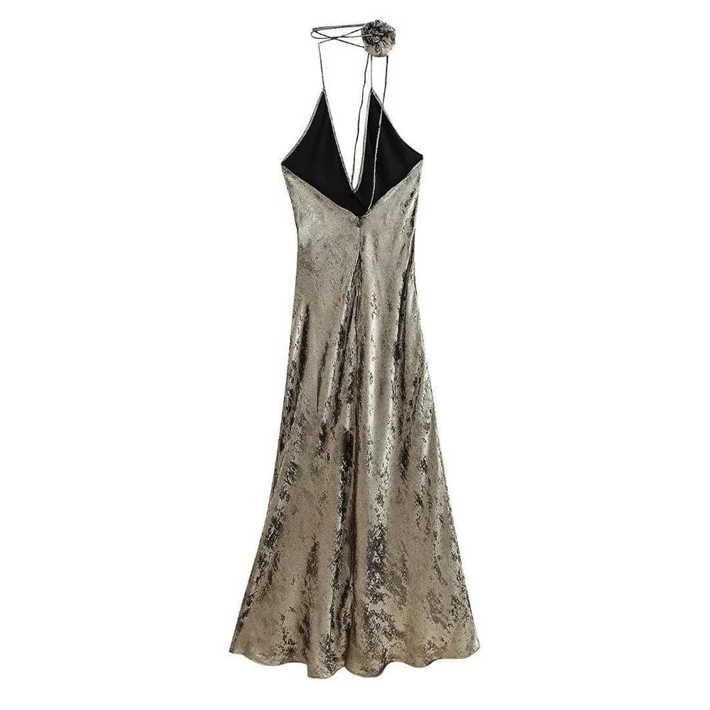 Vestido largo con amarre en cuello y escote en V.
