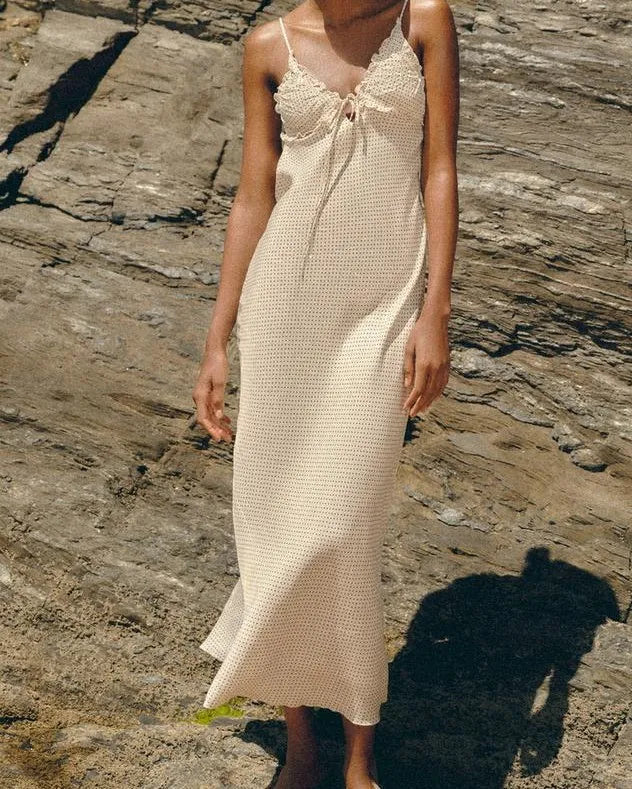 Ligero. Femenino Un vestido de algodón que combina suavidad con una silueta que estiliza. El escote delicado con detalle ajustable y tirantes finos crean una estética sutilmente romántica, mientras el largo midi mantiene elegancia natural.